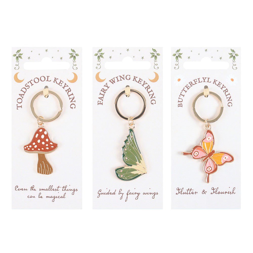 These fairy-themed keyrings have a magical woodland feel and include a red toadstool, green fairy wings or a pink butterfly on a matching MDF display. Designed as part of the Fairy Folklore collection of woodland gifts and home decor.